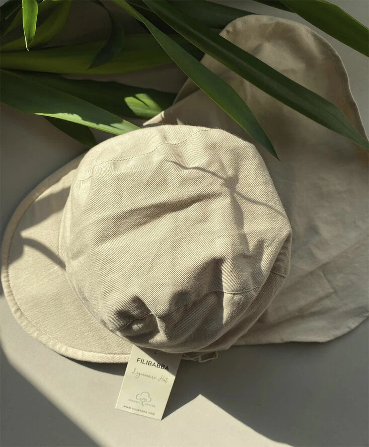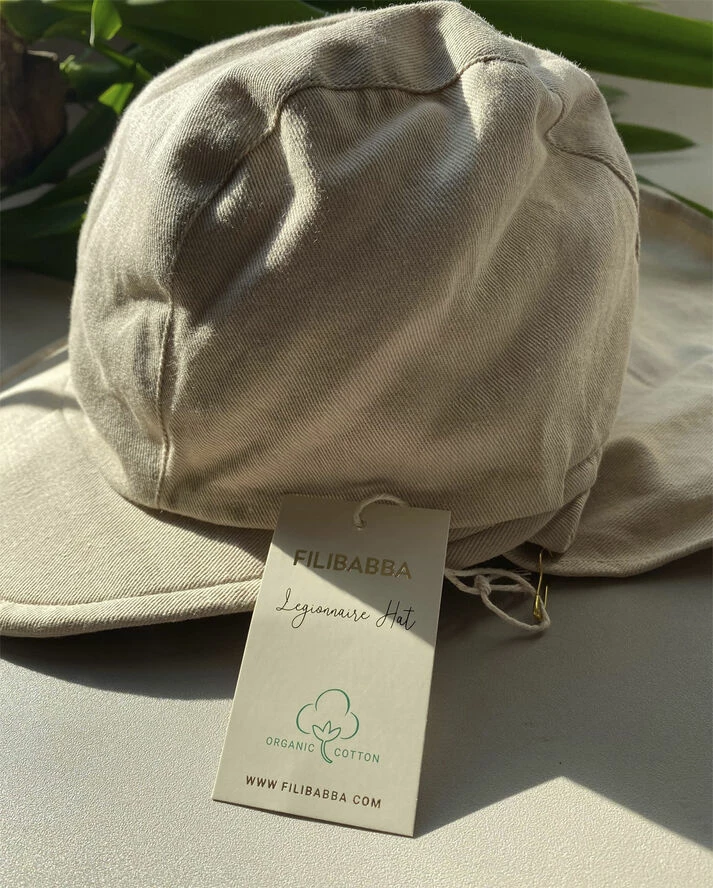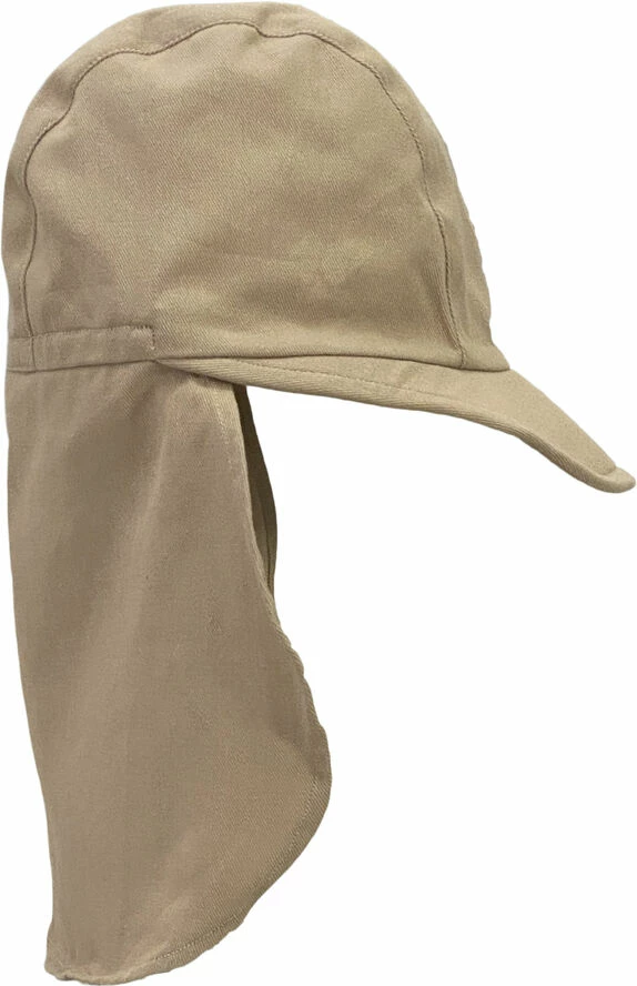 Klassisk legionær-solhat med en fast skygge foran og en lang skygge i nakken, så både ansigt, ører og hals er beskyttet mod solen. Solhatten er lavet af 100 % GOTS-certificeret økologisk bomuld, som er åndbart. Hatten kan nemt justeres med en elastik-clips på bagsiden og passer fra 1-3 år.