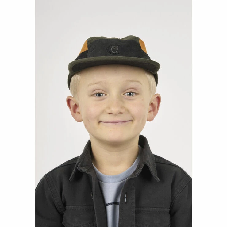 "KnowledgeCotton Apparel baby cord cap in 5 panels. The cap has a straight shadow and a tonal logo badge on the front. "