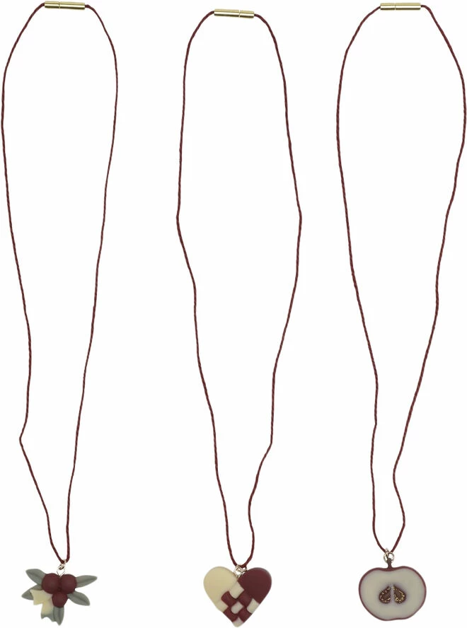 "Three necklaces with different charms made in polyresin and brass. Each necklace has a magnetic safety closure. Not recommended for children under three years. Warning- Strangulation hazard"