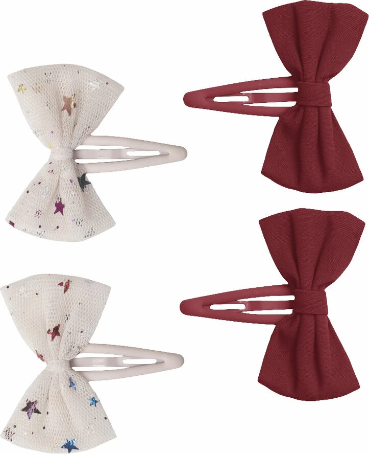 "Hairclips with bows made in 100 percent tulle with foil print and spring steele clips."