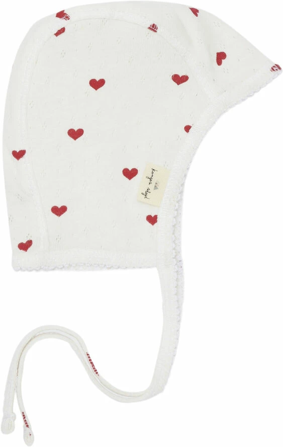 "Soft helmet made in 100 percent organic pointelle cotton with picot edges. Designed with a round shape and two straight ties allowing it to be tied under the chin."
