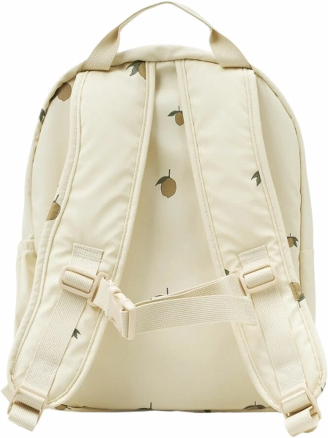 "Water repellent and spacious backpack. An external bottle pocket keeps the childs water close at hand. A chest strap makes sure that the backpack is comfortable and supports the back. The backpack is very light, which is an important ergonomic factor. On top it has a solid loop hanger to hold or hang on a rack. Inside the bags large compartment, you can write the childs name and three small pockets make it easy to keep order. The backpack can be worn all year as it is made to resist erratic weather, dirt repellent and easy to clean. -Material- 100% POLYURETHANE/100% POLYESTER LINING -Technical functions- WATERPROOF LEVEL 3000 WITH BIONIC FINISH ECO TREATMENT, OEKO-TEX® Standard 100 -Onesize. Height 34 cm., width 25 cm. Shell and lining is made in 100% organic cotton with synthetic lining Padding is made in 100% polyester Cleaning instructions- Washable at 30 degrees C The effect of the coating will ease off if washed often. "