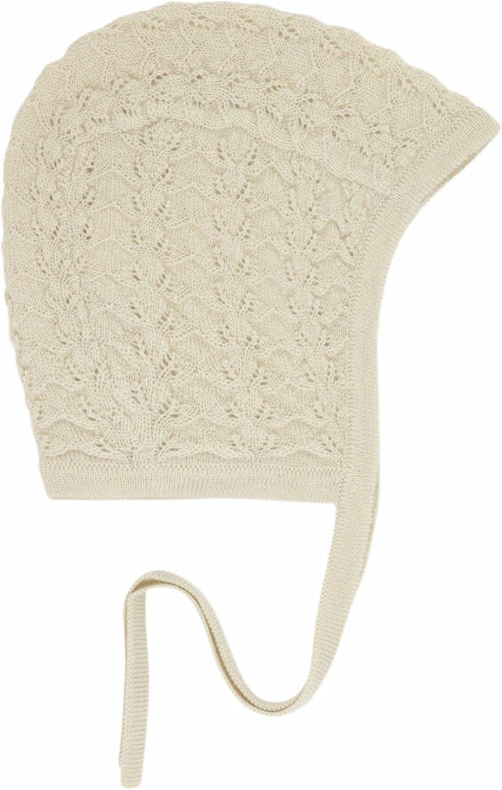 "Snug and warm pointelle knit helmet made in 100 percent soft merino wool. Designed with a round shape and two straight ties allowing it to be tied under the chin. "