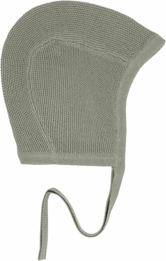 "Snug and warm pointelle knit helmet made in 100 percent soft merino wool. Designed with a round shape and two straight ties allowing it to be tied under the chin. "