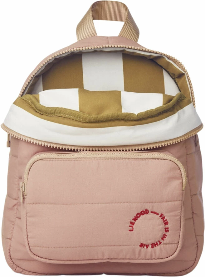 QUILTED BACKPACK Classic backpack in a clean and quilted design Fits children aged 3-7 years BIONIC-FINISH ®ECO water repellent coating Horizontal stitching Lining in a contrast colour or print Adjustable shoulder straps Top grab handle Large main compartment with a two-zipper closure Exterior front pocket for smaller items Embroidered LIEWOOD statement on the front pocket