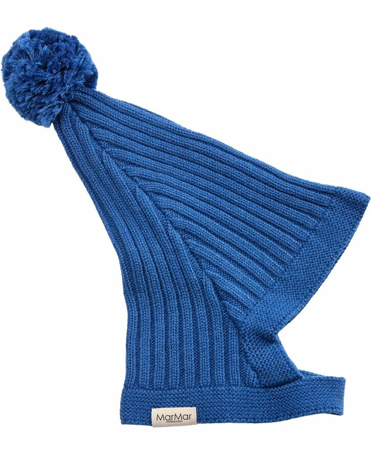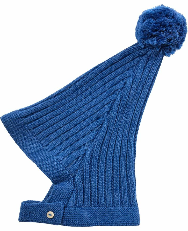 Sød hue med pompom, der går ned over ørene, med en rem under hagen der lukkes med knap i 2 længder