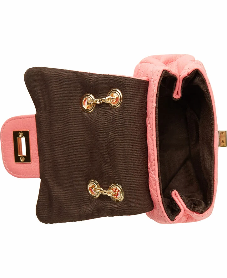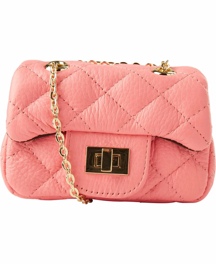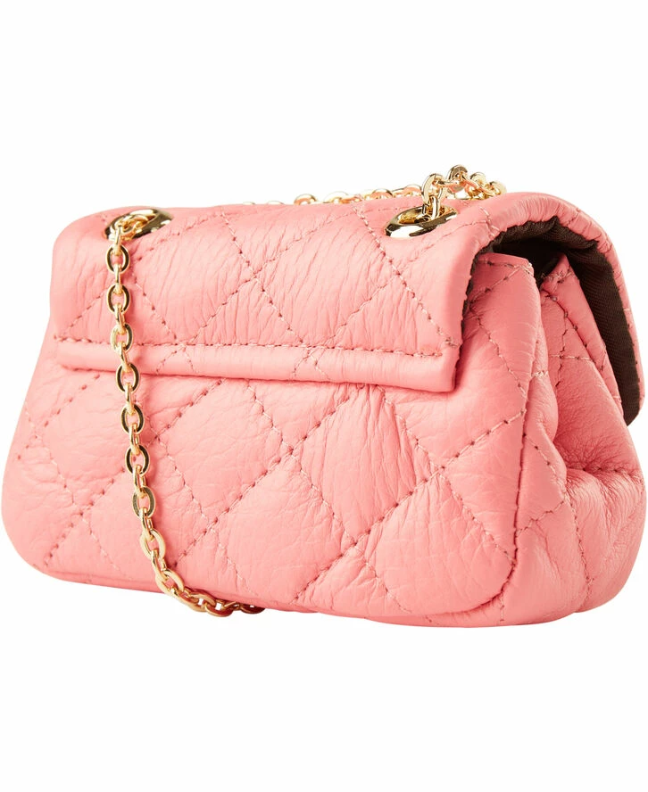 A mini sized quilted leather bag, with a classic design in a baby pink colour.