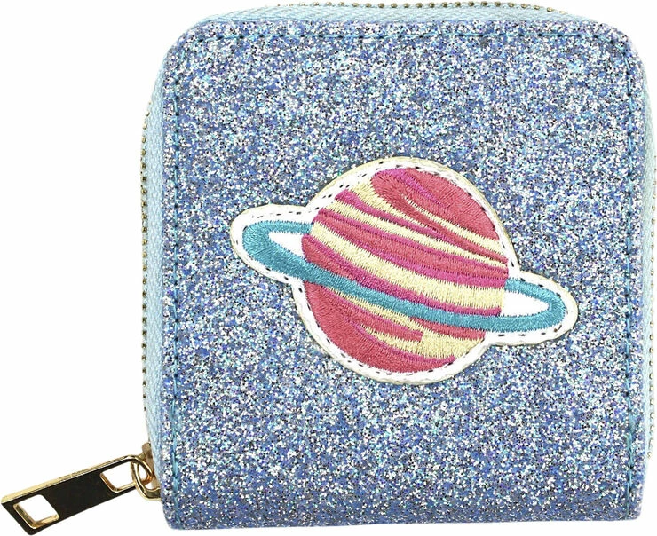 A shimmery planet wallet with white sparkles and sequins. Featuring a zipper closure with compartments.