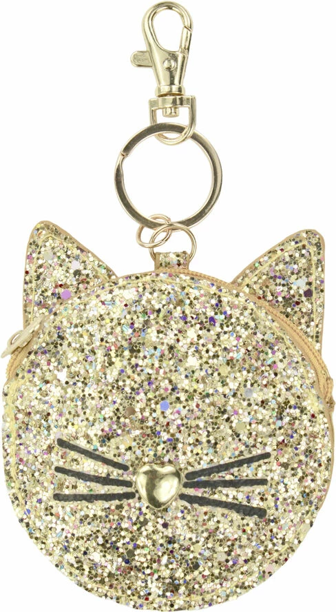 A sparkly coin wallet with a golden cat design. Featuring a zipper closure and a keychain.