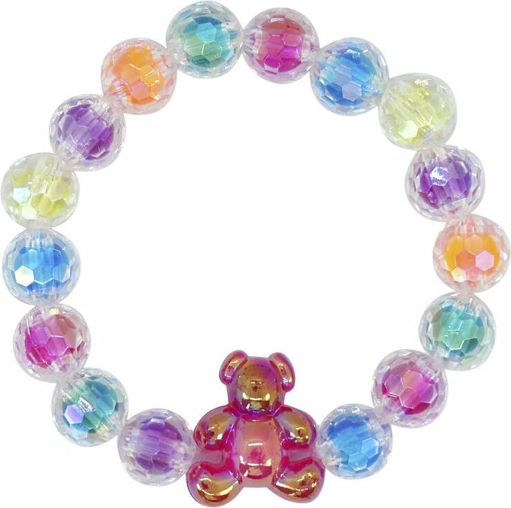 A rainbow beaded bracelet with a cute teddy bear, in a multi colour design.