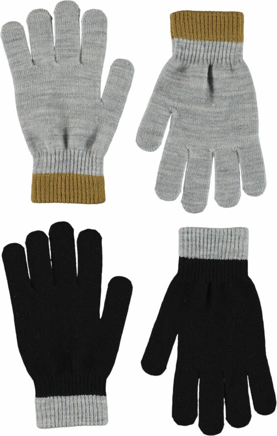 To par strik handsker. Det ene par er grå med gult ved håndleddet, mens det andet er sort og gråt.
