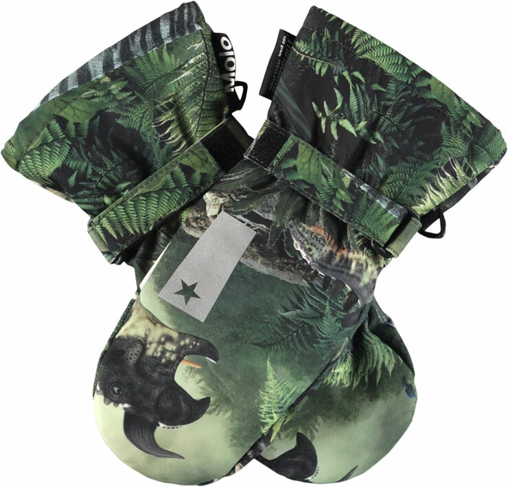 Molo's vandtætte og åndbare luffer Mitzy har 3M Thinsulate isolering. Her i grøn med et sejt print af dinosaurier. Mitzy har justerbar velcro og elastik ved håndleddet samt en refleks på forsiden. Dette produkts ydermateriale er 59% recycled og fremstillet af genanvendt polyester. Handskerne har en vandafvisende PFC-fri imprægnering (indeholder f.eks. ikke PFOS, PFOA og lignende). Vandsøjletryk: 10.000 mm. Åndbarhed: 8.000 g/m2/24t.