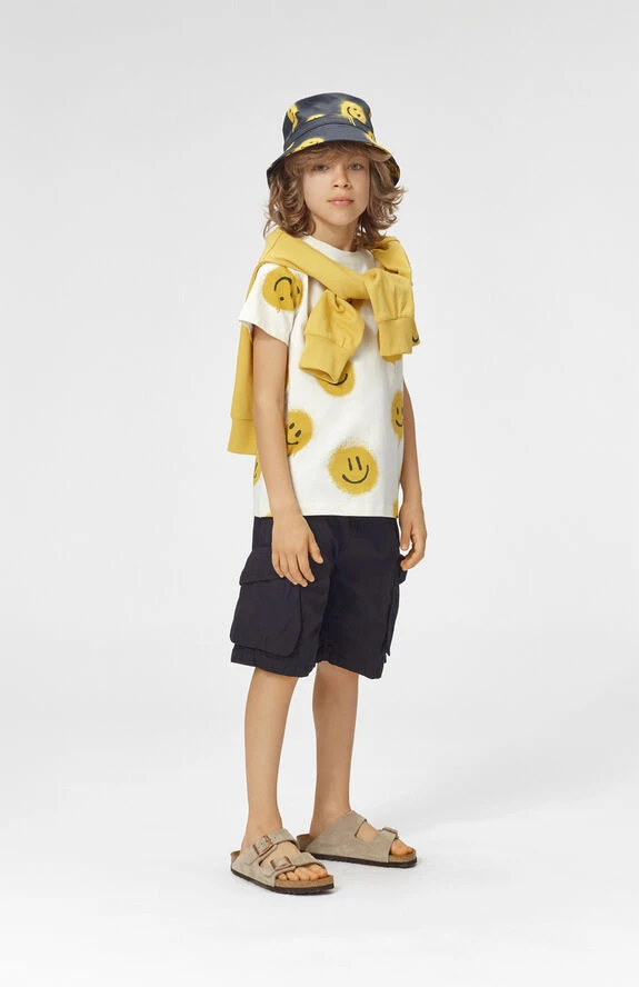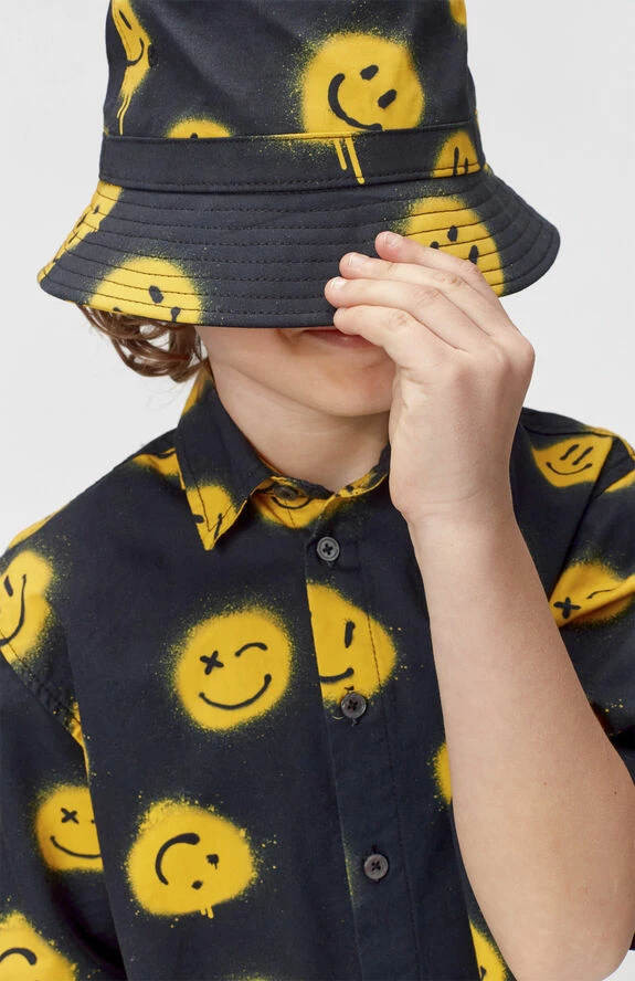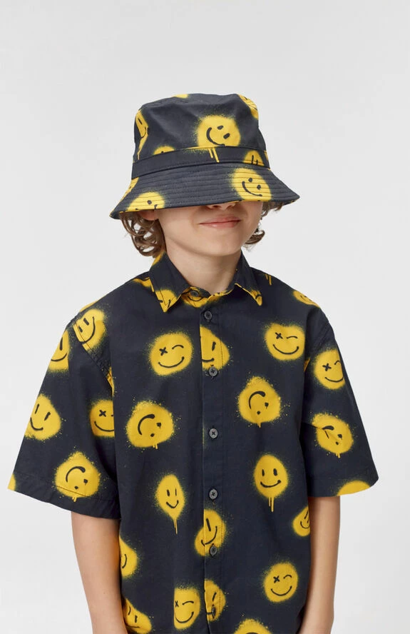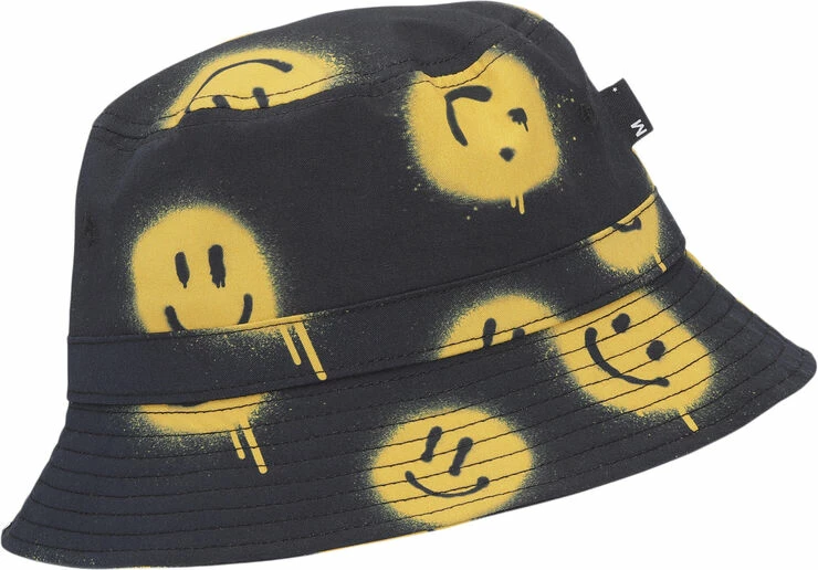 Bøllehatten Siks i sort har et cool print med spraymalede smilende-ansigter. Den brede skygge beskytter mod solens skarpe stråler.