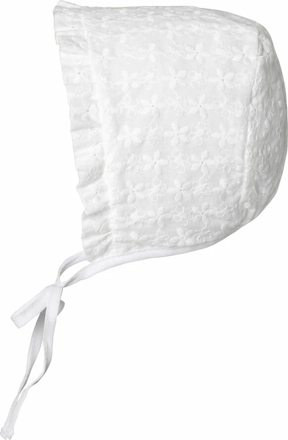 Adorable baby bonnet in solid color embroidery anglaise and an edge ofruffles. The summer hat has a